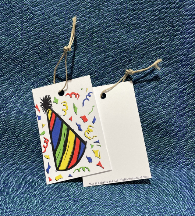 Set of 5 gift tags with the “party hat” design on the front and a blank back. Comes with a set of 5 strings to use to attach the tags to a gift.